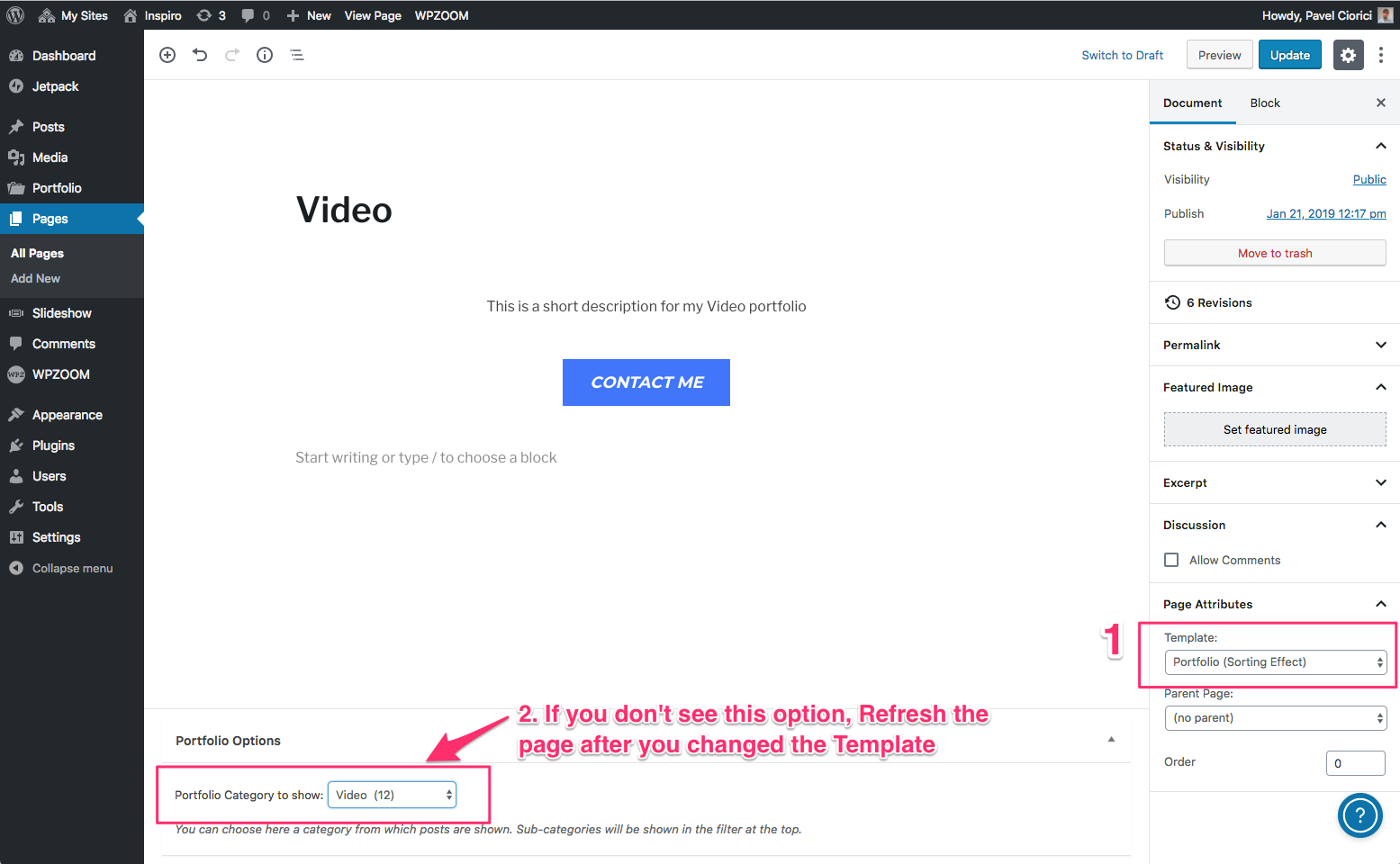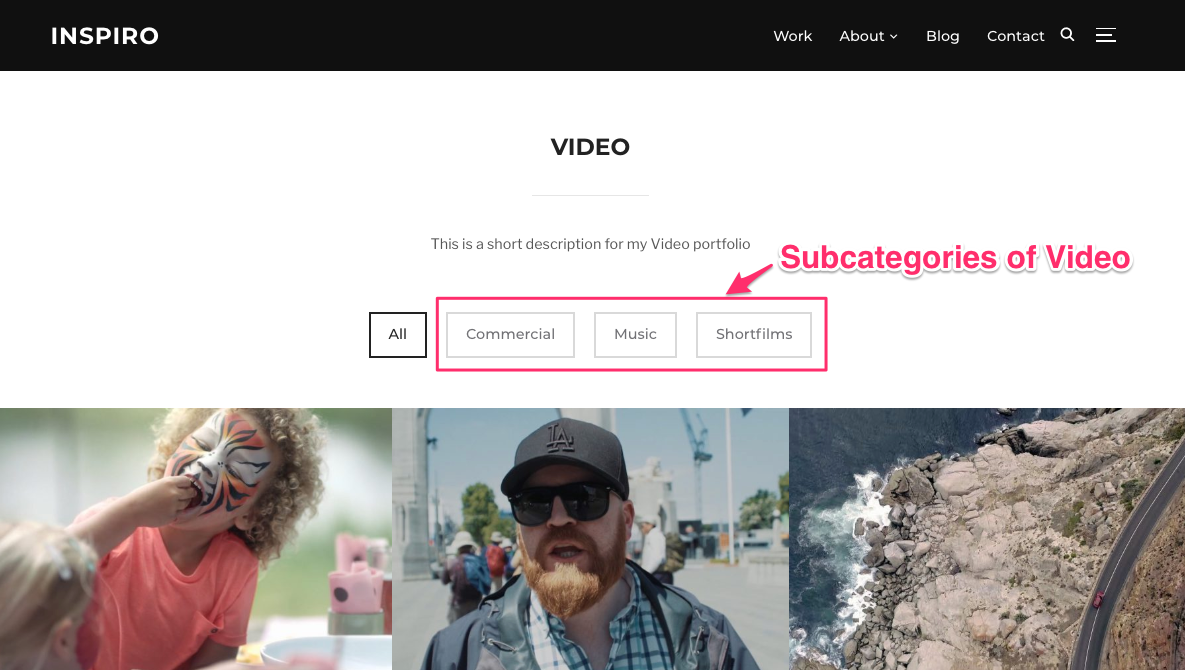 Starting with Inspiro 6.2 you have the ability to create multiple Portfolio pages showing different posts.