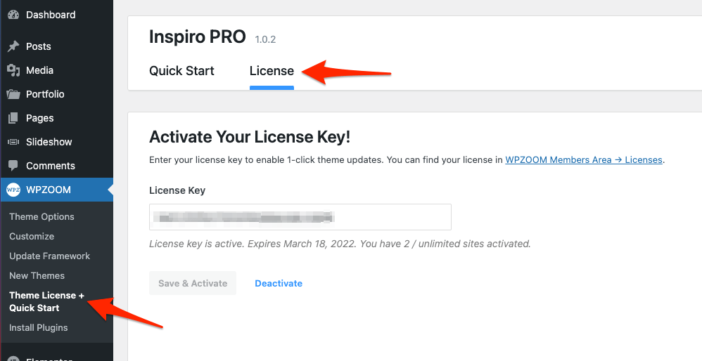Copy the License Key, then add it to the WPZOOM > Theme License + Quick Start > License tab.