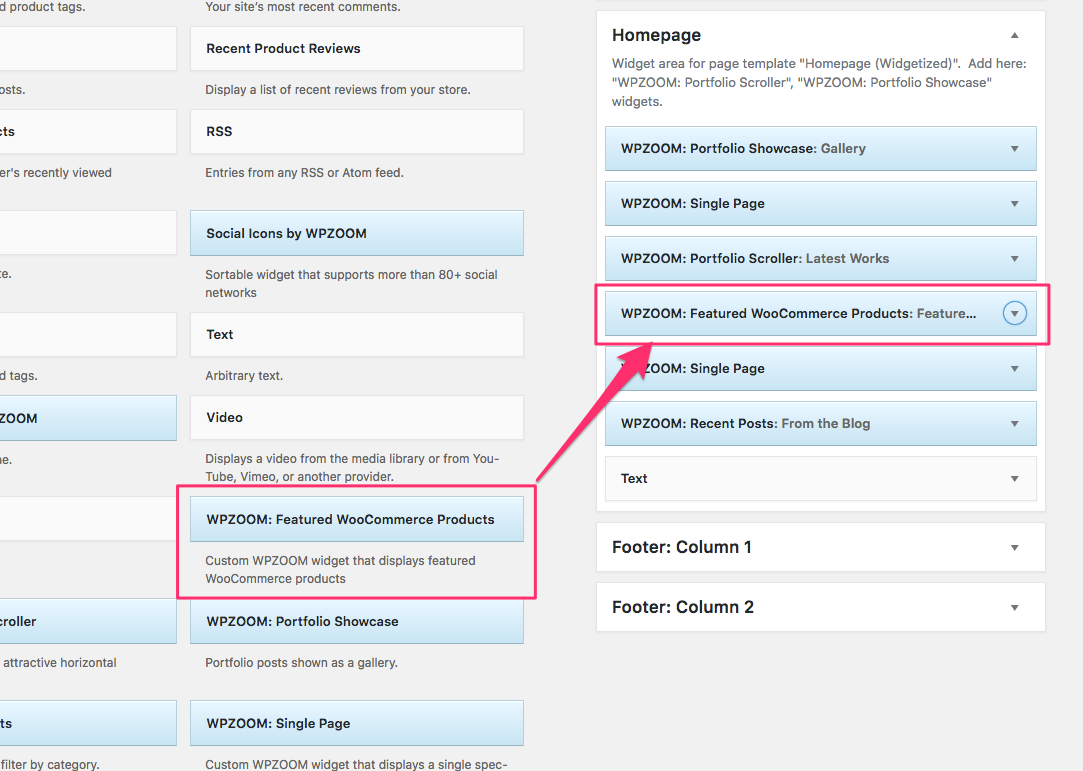 Once you have marked a few products as Featured, you can now display them on your homepage or a different page by inserting the WPZOOM: Featured WooCommerce Products in the Homepage widget area in case you’re using the Homepage: (Widgetized) page template: