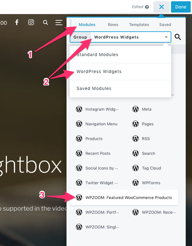 If you’re using Beaver Builder for your page layout, you can find the WPZOOM: Featured WooCommerce Products widget in the Modules > WordPress Widgets: