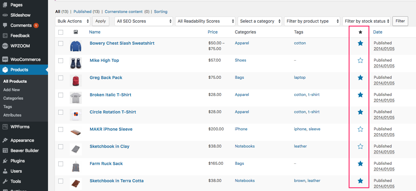 You can mark individual WooCommerce products as Featured from the All Products page. All you have to do is to click on the ⭐ Star icon next to each product: