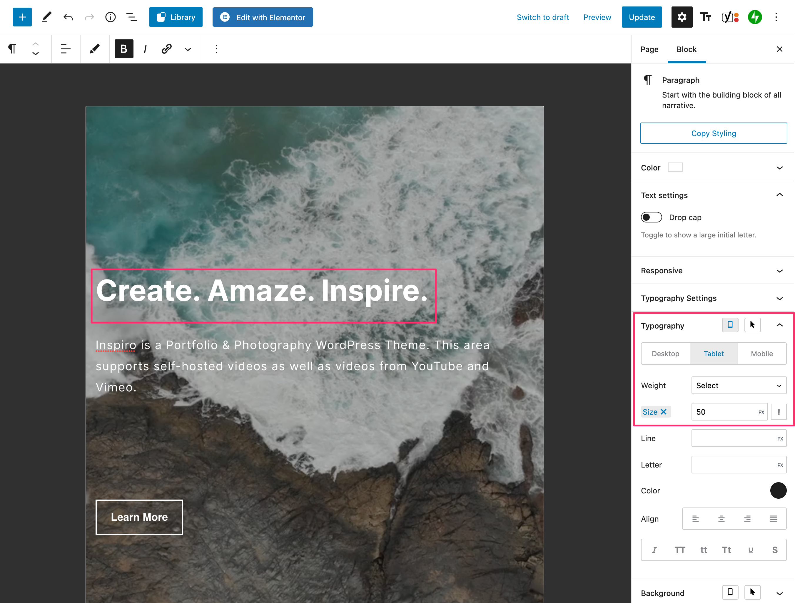 Above, you can see that using this block, you can create a very similar section to the hero area in the Inspiro Lite theme.