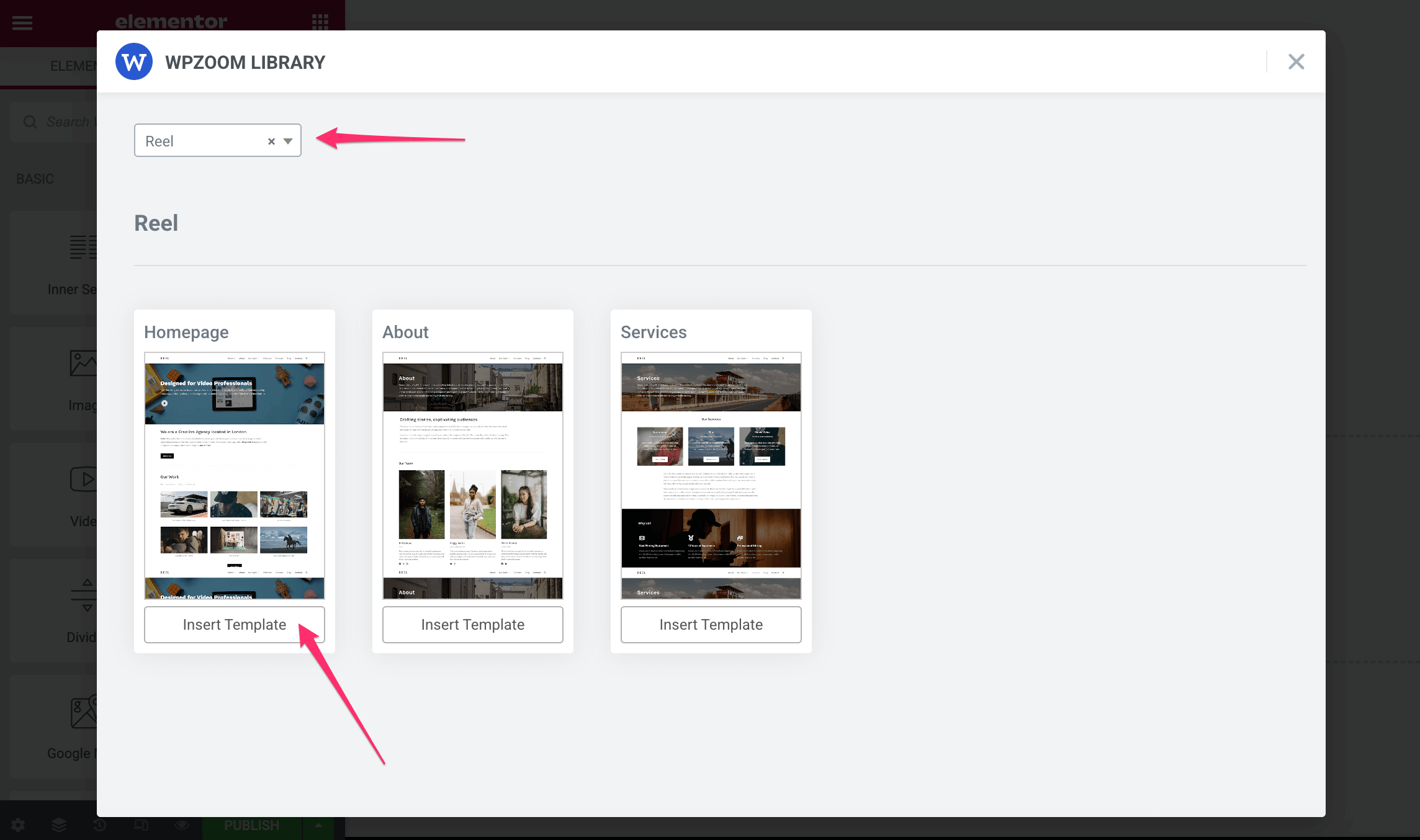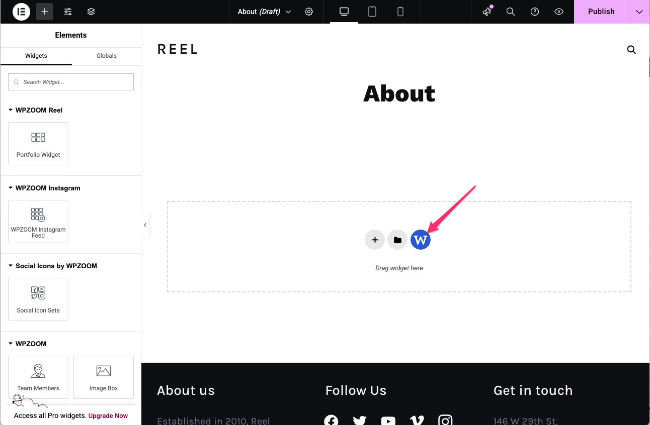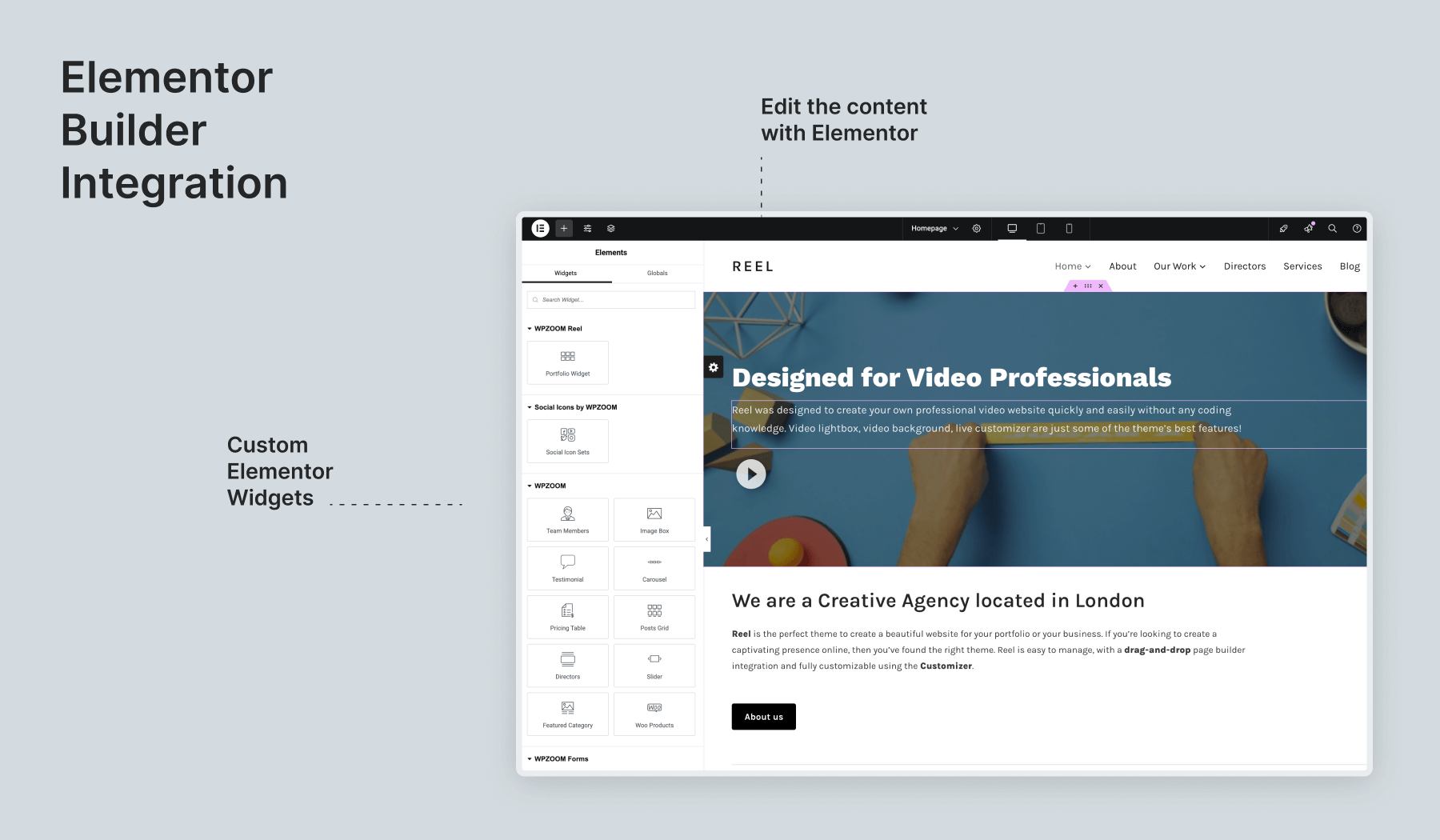 Starting with version 3.1.0, Reel is integrated with the Elementor page builder. The demo integrated with it is achievable using the free version of Elementor and our free plugin Elementor Addons by WPZOOM.