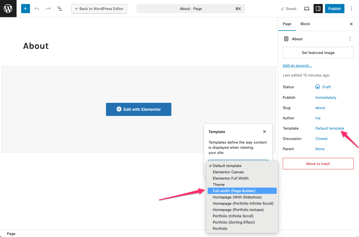 Choosing the right Page Template for pages that you’re building using Elementor is very important. Make sure to select a page template that’s created specifically for a Page Builder: Full-width (Page Builder).