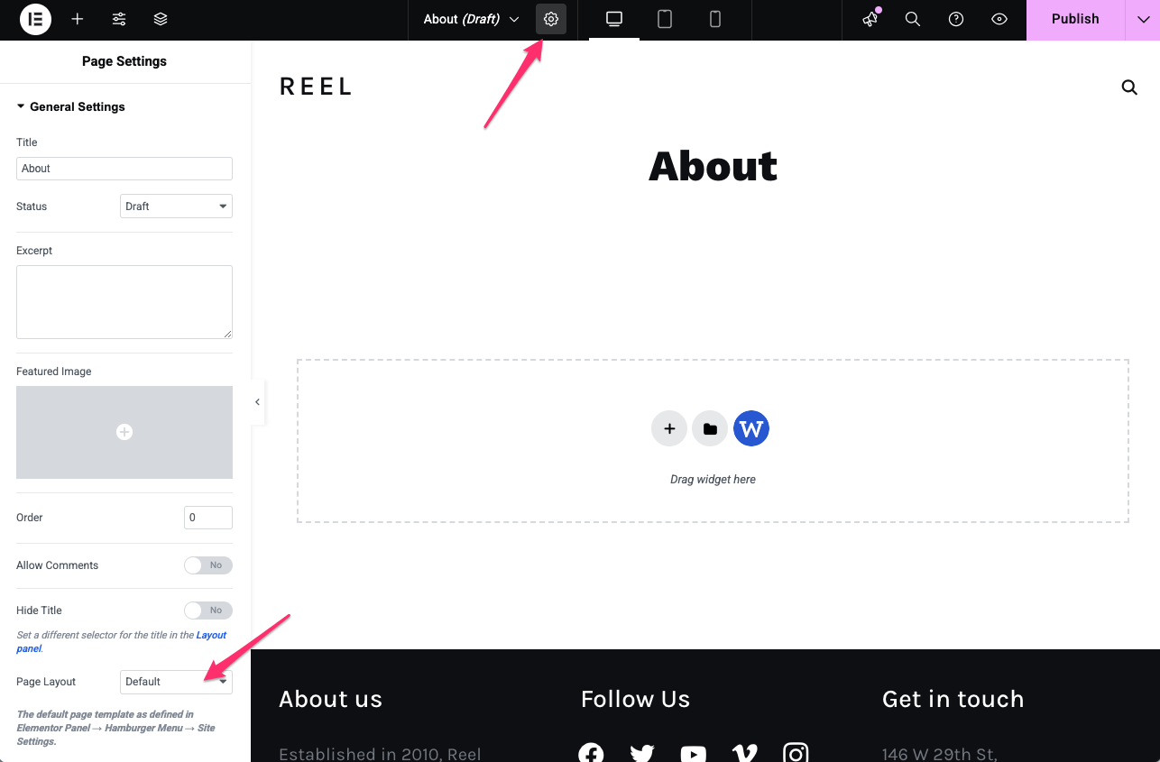 When using the Elementor editor, click the “Page Settings” icon from the top toolbar, then look for the “Page Layout” option: