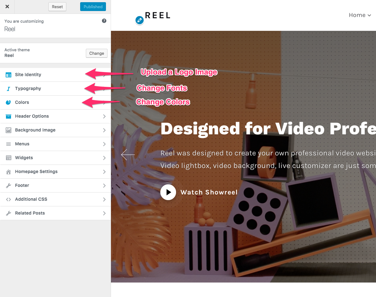 In Reel many options can be changed and customized from Theme Customizer. You can access the Customizer from Themes Page.