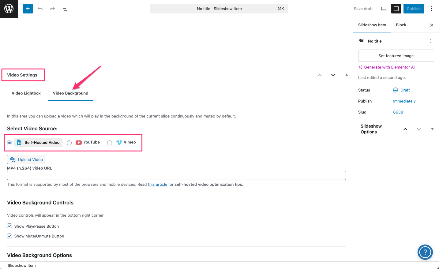 When you create a Slideshow post, find the Video Background tab in Video Settings section: