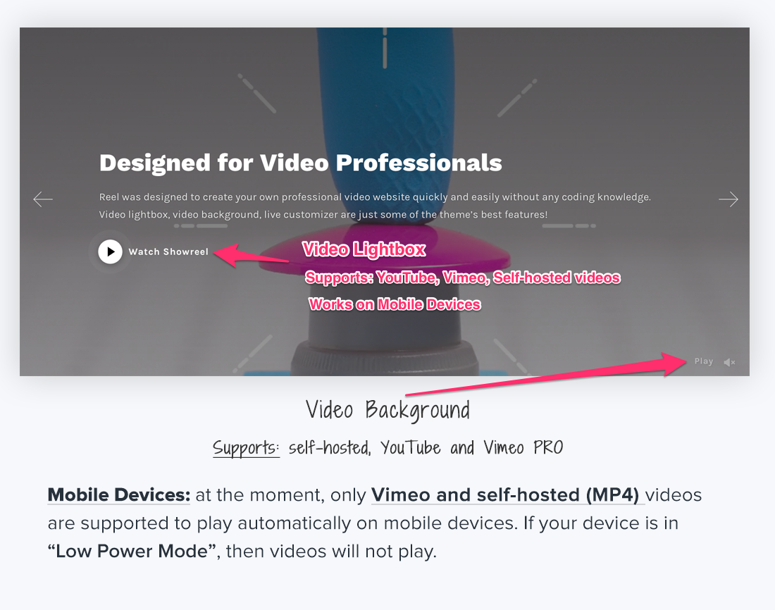 However, starting with Reel 2.0 (February, 2019), self-hosted (MP4) and Vimeo videos are now supported by the most mobile devices. Unfortunately, YouTube videos cannot be played automatically in background on mobile devices