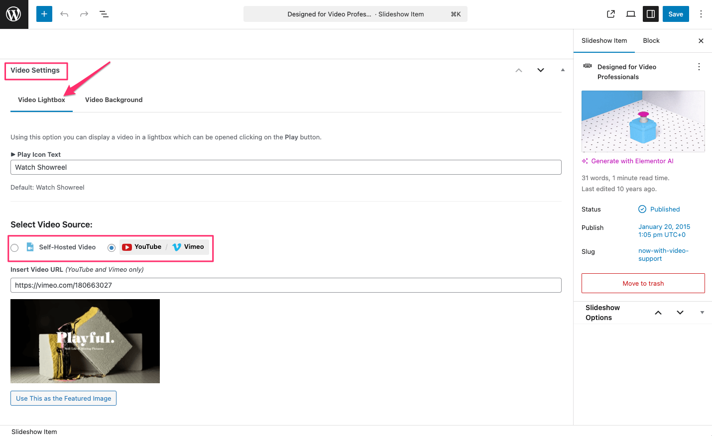 Using Video Lightbox you can display a YouTube, Vimeo or even a self-hosted video in the slideshow and portfolio posts in a lightbox.