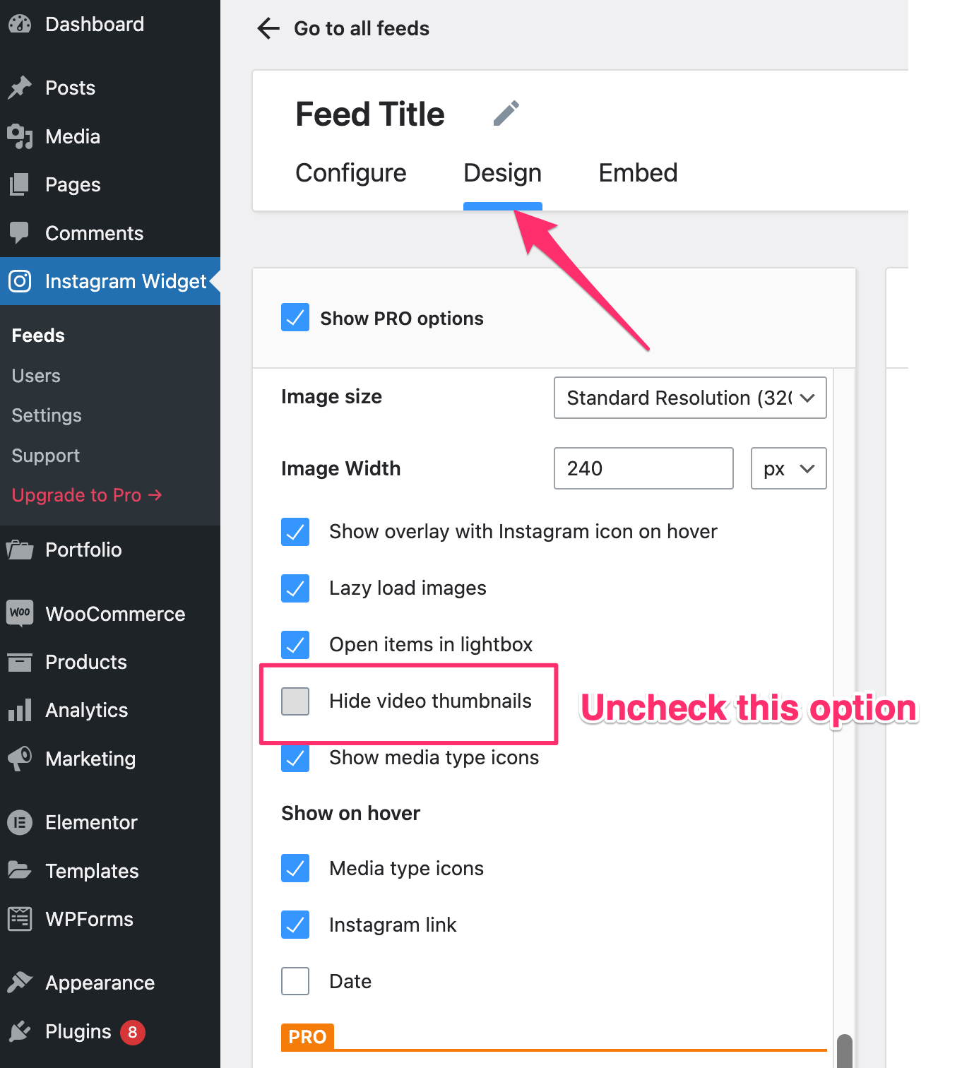 If none of your videos from your Instagram account are showing in the feed, make sure to uncheck the following option from the Design tab when editing a feed: “Hide video thumbnails“.