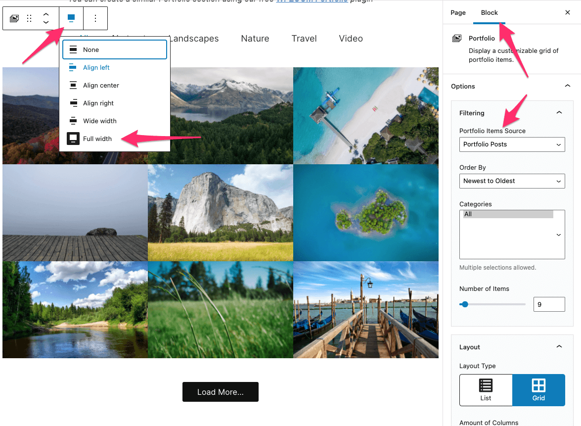 The Portfolio Block includes multiple options. The first thing you may want to do, is to change its alignment to Full width: