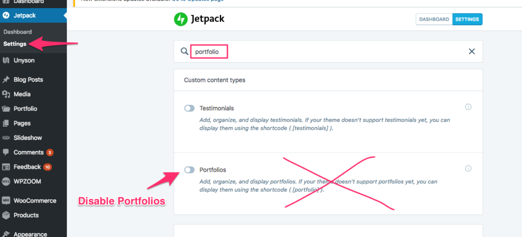 Jetpack – this plugin also includes a feature that can register a Portfolio post type in your WordPress site, so you need to disable it from Jetpack Settings, by searching for “Portfolio”.