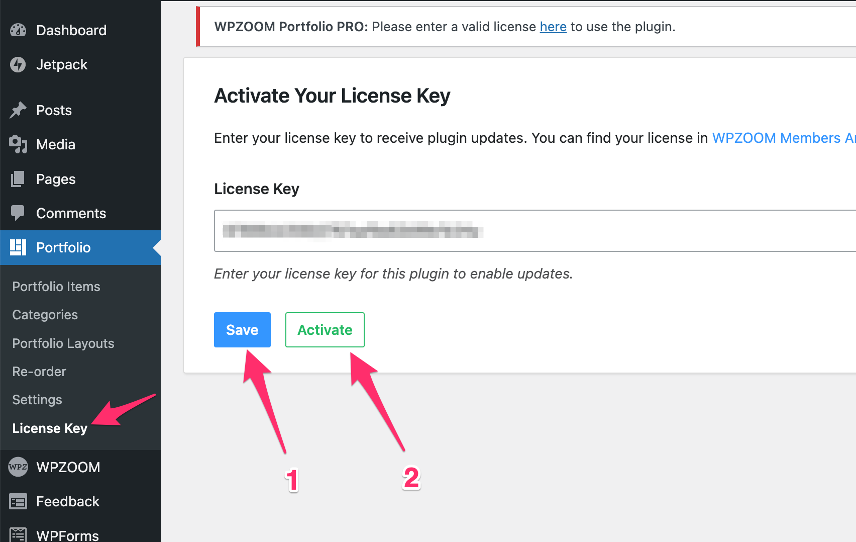 Go to the Portfolio > License Key page and insert your key. Click on the Save button first: