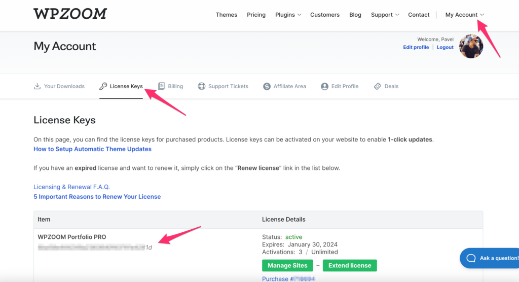After installing and activating the plugin, we recommend you activate your license key in the Portfolio > License Key page to get updates in the future and unlock the PRO features.