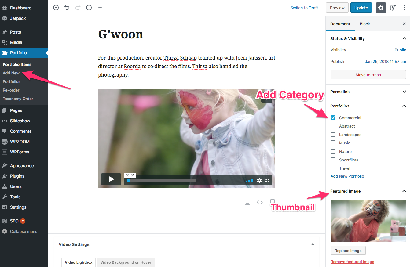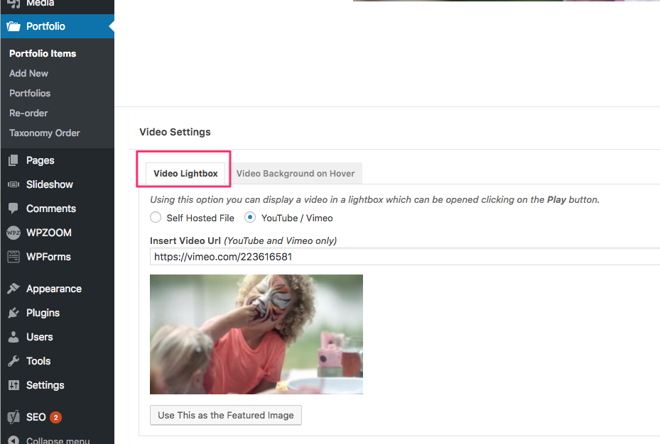 You can attach a YouTube/Vimeo or self-hosted video to each Portfolio post in the Video Settings area: