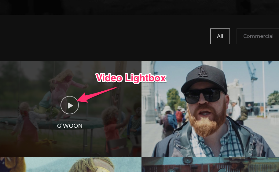 When viewing the Portfolio block in a page, a video icon will appear when hovering portfolio posts with a video lightbox: