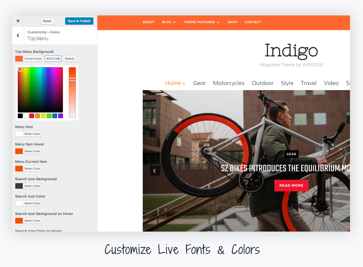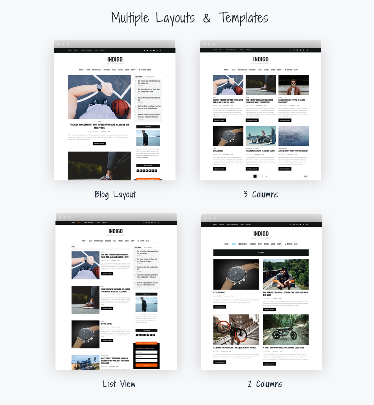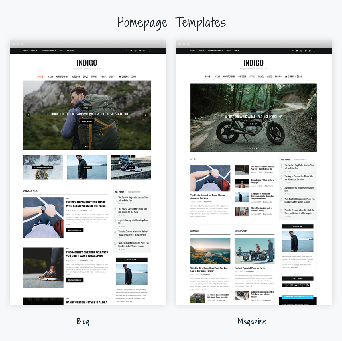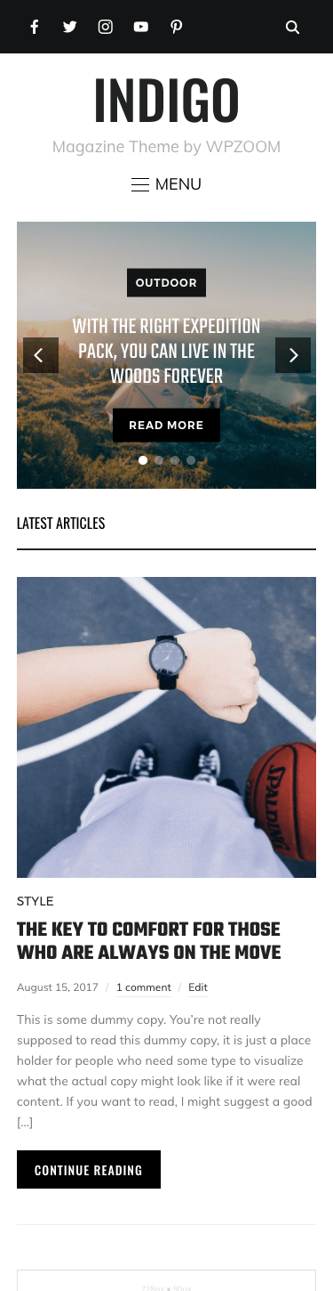 Indigo is a responsive blog and magazine WordPress theme that excels in various niches, from food to sports. It features a layout that adapts beautifully across devices, customizable homepage layouts, unique widgets, and multiple color schemes. Indigo also supports WooCommerce, making it a great choice for e-commerce projects. It also features built-in social sharing and infinite scroll capabilities for enhanced user engagement.